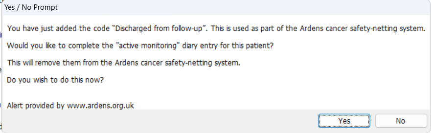 Once the information has been saved, you will be presented with a multiple choice question asking whether you want to complete the 'active monitoring' diary entry, selecting 'yes' will automatically complete the diary entry and remove the alert.