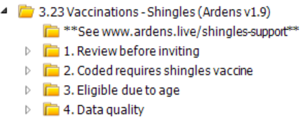 To locate the searches, navigate to the Population Reporting module > Ardens Searches > 3.23 Vaccinations - Shingles search folder: