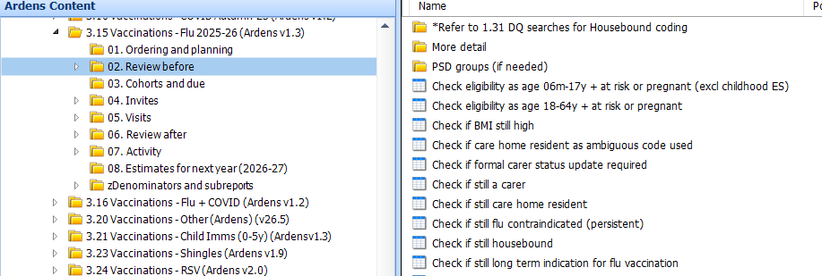 Navigate to Ardens Searches > 3.15 Vaccinations - Flu 2025-26 > 0.1. Ordering and planning.
