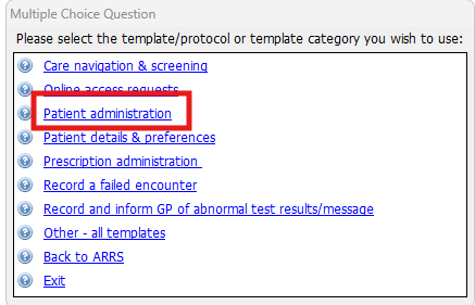 The results will return the Coding template (Reception Admin) (Ardens)' template (if you are unable to locate the template, check with your Practice Manager/IT Manager that this is activated in the background).