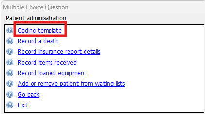 Once set up, you can launch this template using the Reception Template launcher protocol from the F12 key. Press F12 on your keyboard and select the Patient administration > Coding template option.