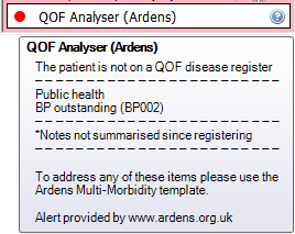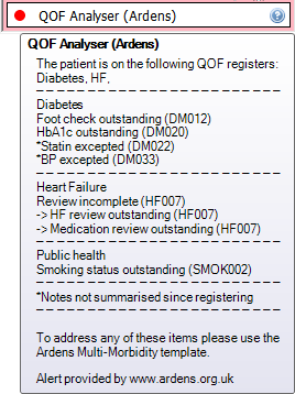 The Ardens QOF Analyser alerts practice staff to any outstanding QOF indicators for the patient. It has been designed to declutter the pink alert box by consolidating multiple QOF entries into a single alert, summarising work to be done.