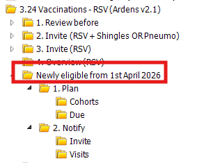 The Newly eligible from 1st April 2026 folder will identify patients eligible from 1st April 2026. The 1.Plan folder is further broken down by Cohorts and Due folders, enabling practices to estimate the number of vaccines required. The 2. Notify folder is then further broken down by Invite identifying those patients who need to be invited for their vaccine and Visits identifying eligible patients in a care home or housebound that will require a visit.