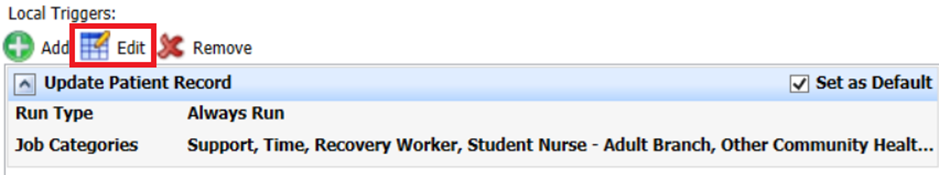 The Edit Trigger screen will display, allowing you to make changes to the System Trigger, the Run Mode or to edit the Job Categories, for whom this protocol or alert will show.