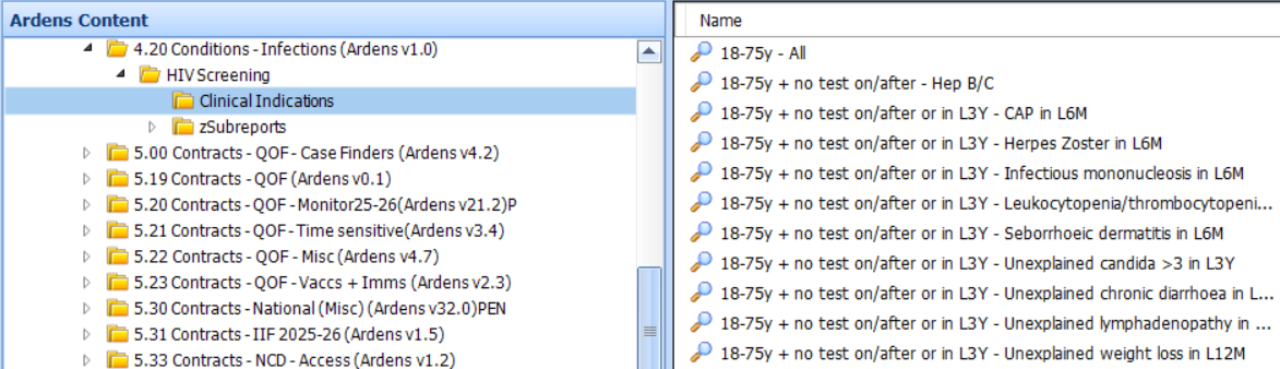 The Ardens HIV searches identify patients with clinically indicated conditions who may be appropriate to invite for HIV screening.