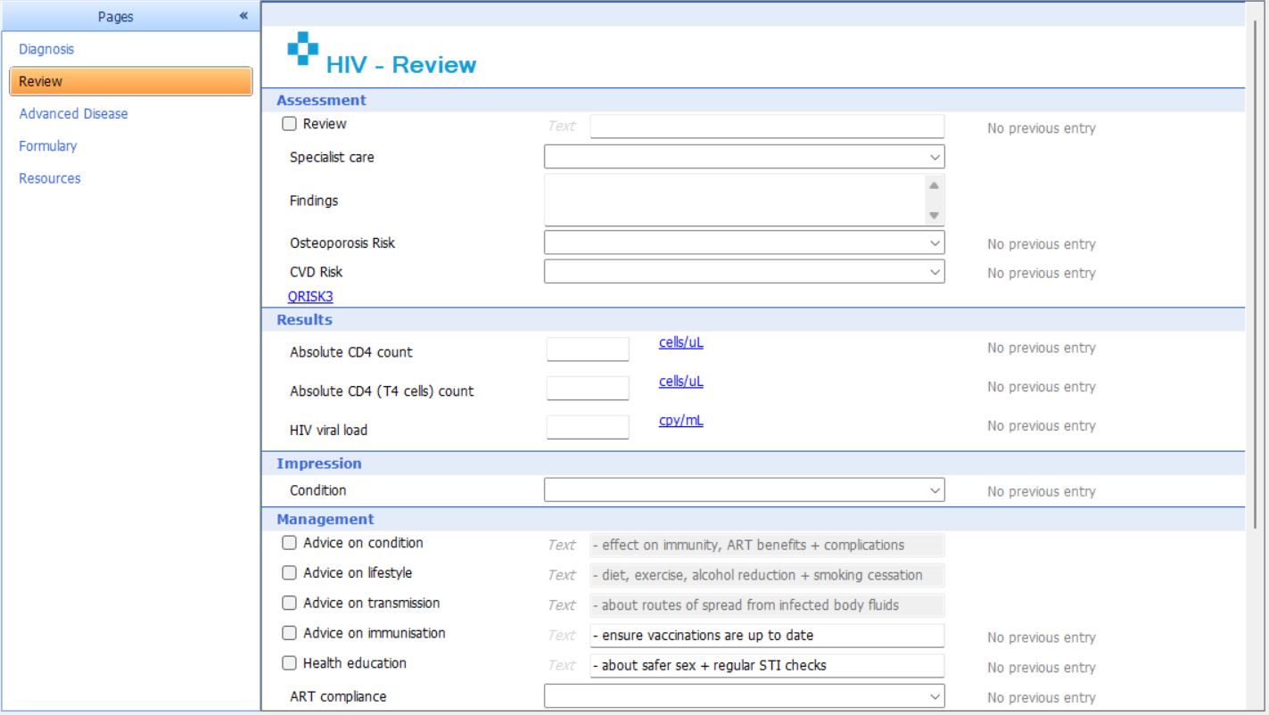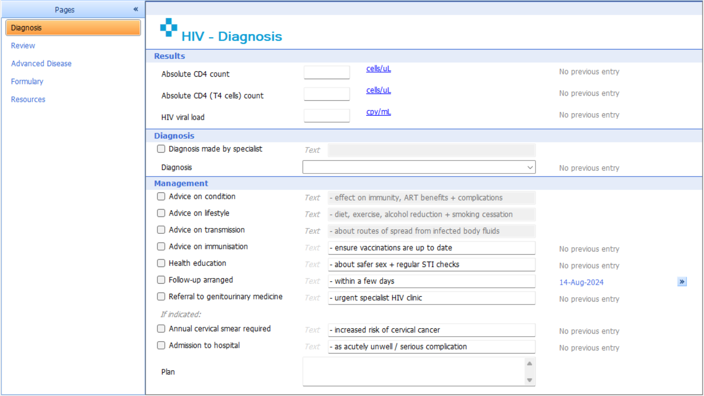 Using the HIV (Ardens) template ensures accurate coding when an HIV diagnosis is recorded. The template displays previous CD4 counts, HIV viral load results and provides a curated list of appropriate diagnostic codes to support correct documentation.