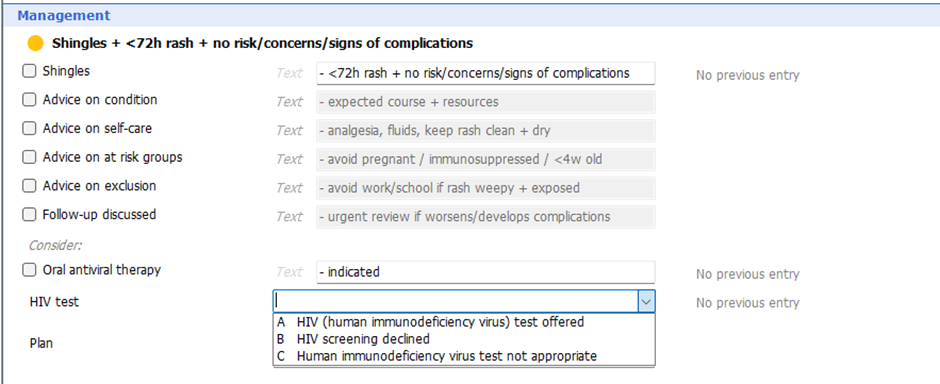 Other templates that include HIV testing prompts include shingles, psoriasis, oral candidiasis, Blood Borne Virus Risk Assessment.