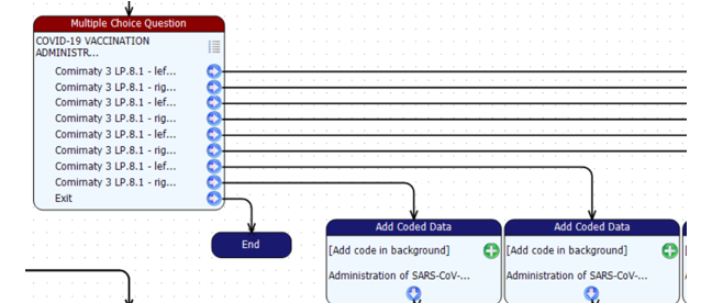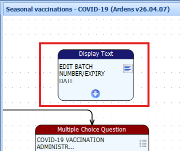 This column contains "Multiple Choice Question" boxes for each vaccine type, with associated "Add Coded Data" boxes. You will need to edit each box to enter the relevant batch numbers and expiry dates for your vaccines.