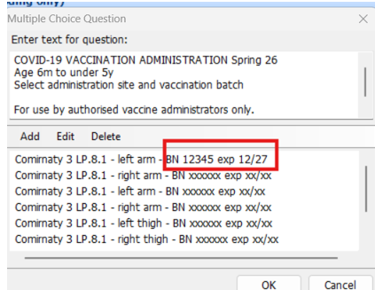 Double-click on the required Multiple Choice Question box, e.g., Comimaty 3, to edit. Select the first option and click Edit. Replace the X with details of the batch number and vaccine.