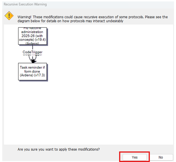 This is EMIS flagging the protocol as potentially causing an endless loop. However, we have included a safeguard to prevent this, so it is safe for you to select 'Yes'.